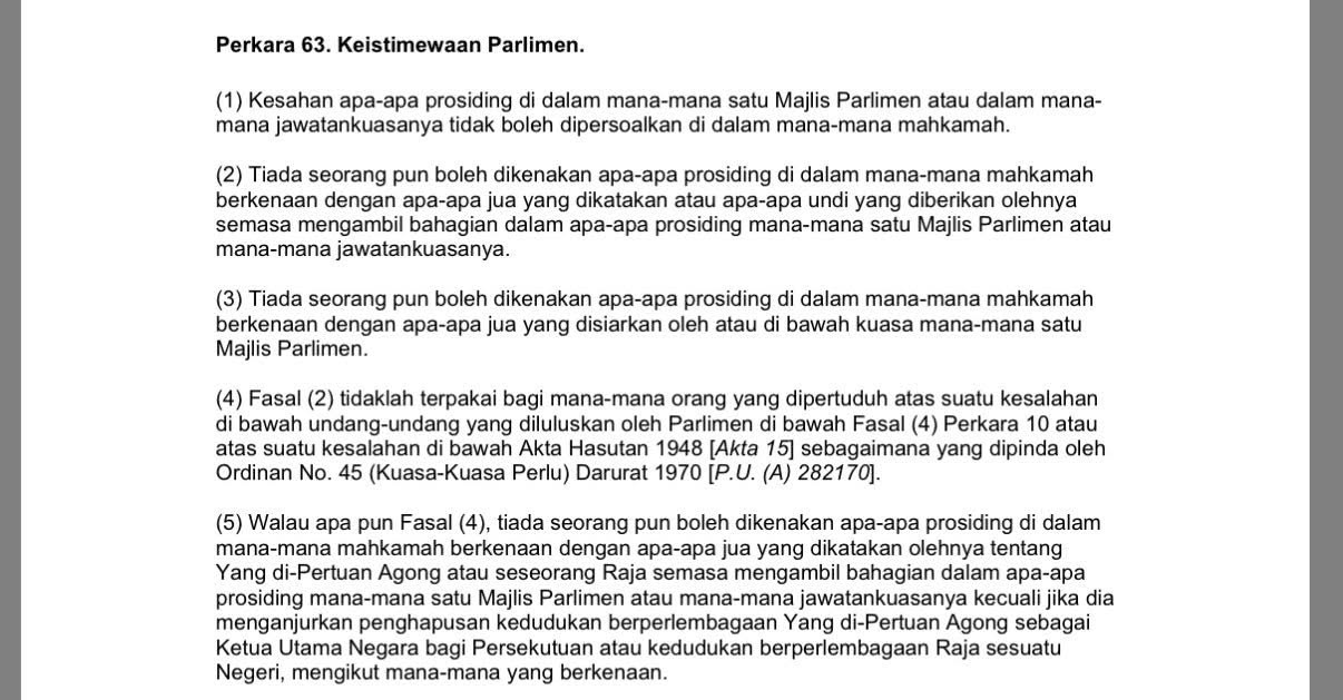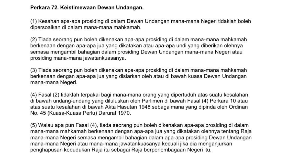 Tapi itu kan untuk Parlimen, adakah DUN juga ada keistimewaan tersebut? Jawapannya, YA. DUN juga mempunyai keistimewaan yang sama. Ini dinyatakan jelas dalam Perkara 72 Perlembagaan Persekutuan (rujuk gambar 3).