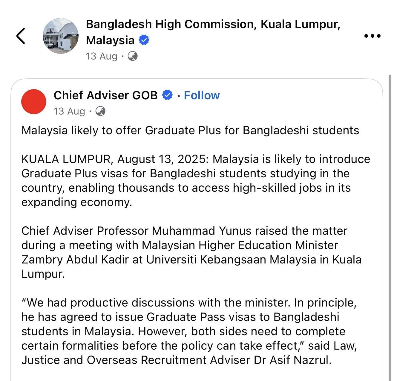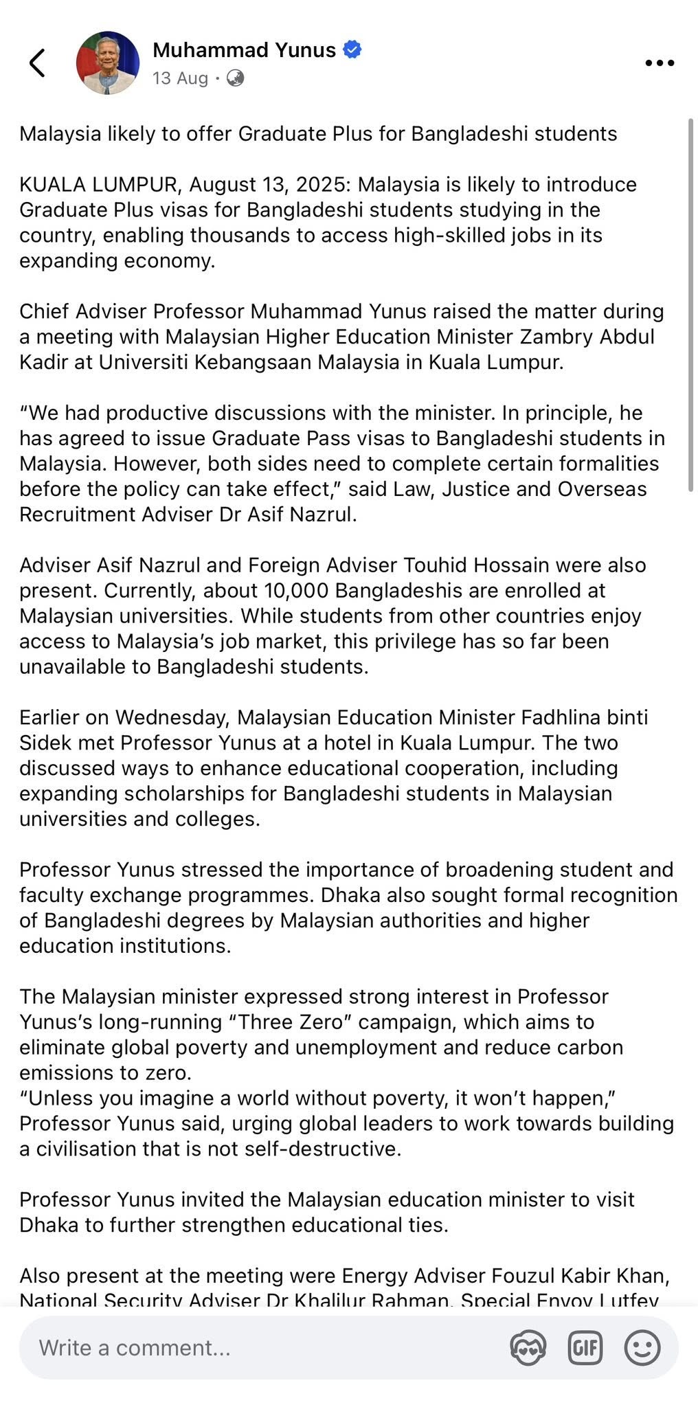 Saya ingin menegaskan bahawa kenyataan saya mempunyai asas yang kukuh. Hal ini kerana laman Facebook rasmi Ketua Penasihat Kerajaan Sementara Bangladesh telah mengeluarkan kenyataan hasil pertemuan antara TYT Prof. Dr. Muhammad Yunus, Ketua Penasihat Bangladesh dengan YB Menteri Pendidikan Tinggi Malaysia.