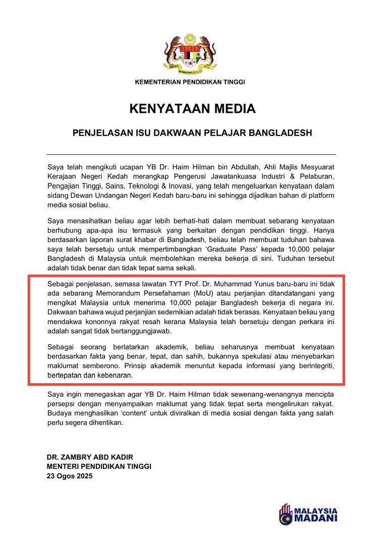 Dalam kenyataan itu, dinyatakan bahawa Malaysia telah bersetuju secara prinsip untuk mempertimbangkan pelaksanaan Graduate Pass bagi pelajar Bangladesh. Maka, adalah wajar saya bangkitkan isu ini bagi mendapatkan penjelasan rasmi daripada pihak kementerian kerana ia menyentuh kepentingan rakyat Malaysia.